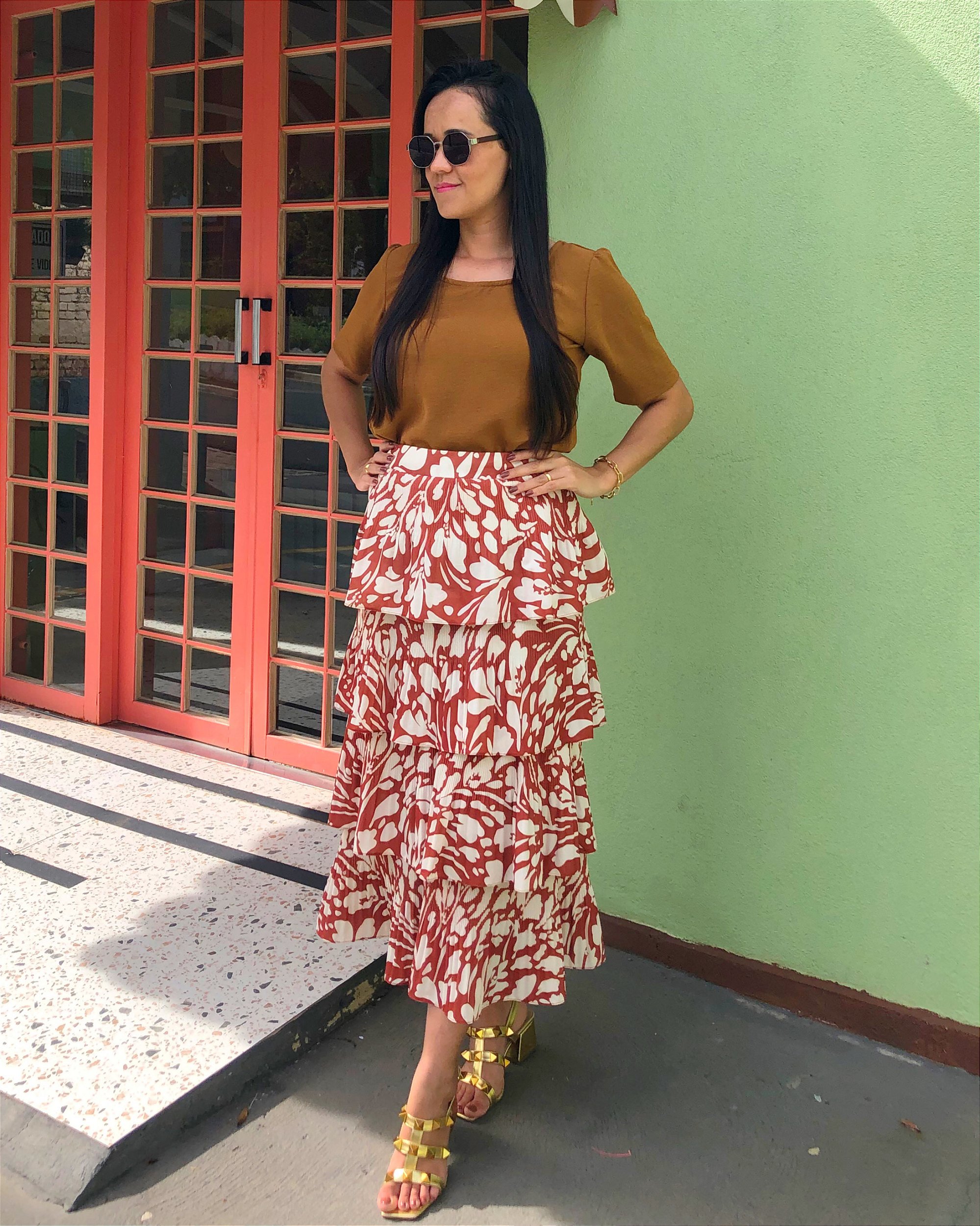 Saia Midi, Confeccionada em Malha Crepe Premium, 04 Babados e Forro entre eles, com Elastico na Cintura.