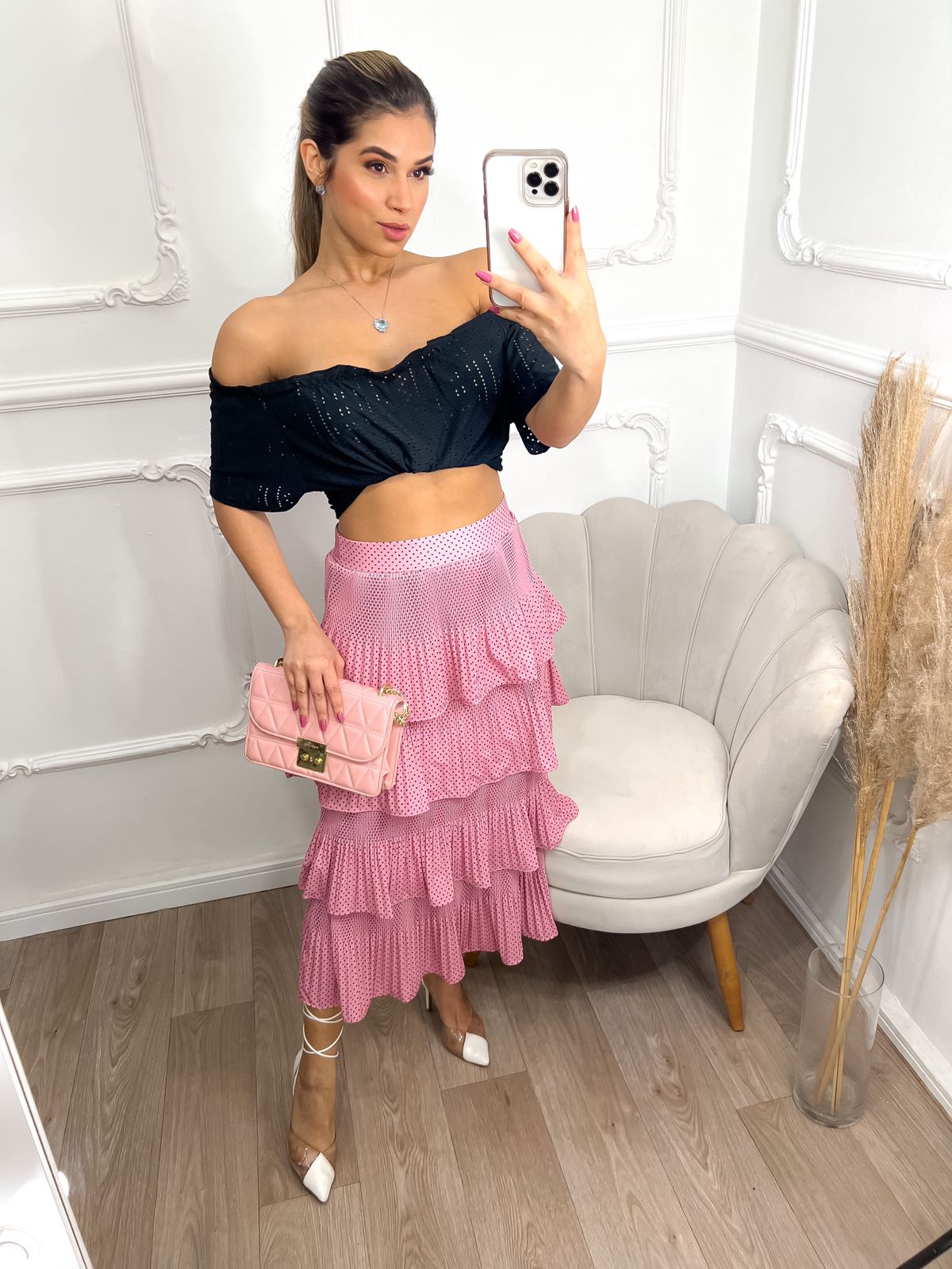 Saia Midi, Confeccionada em Malha Crepe Premium, com 04 Babados e Forro interno! Elastico na cintura.